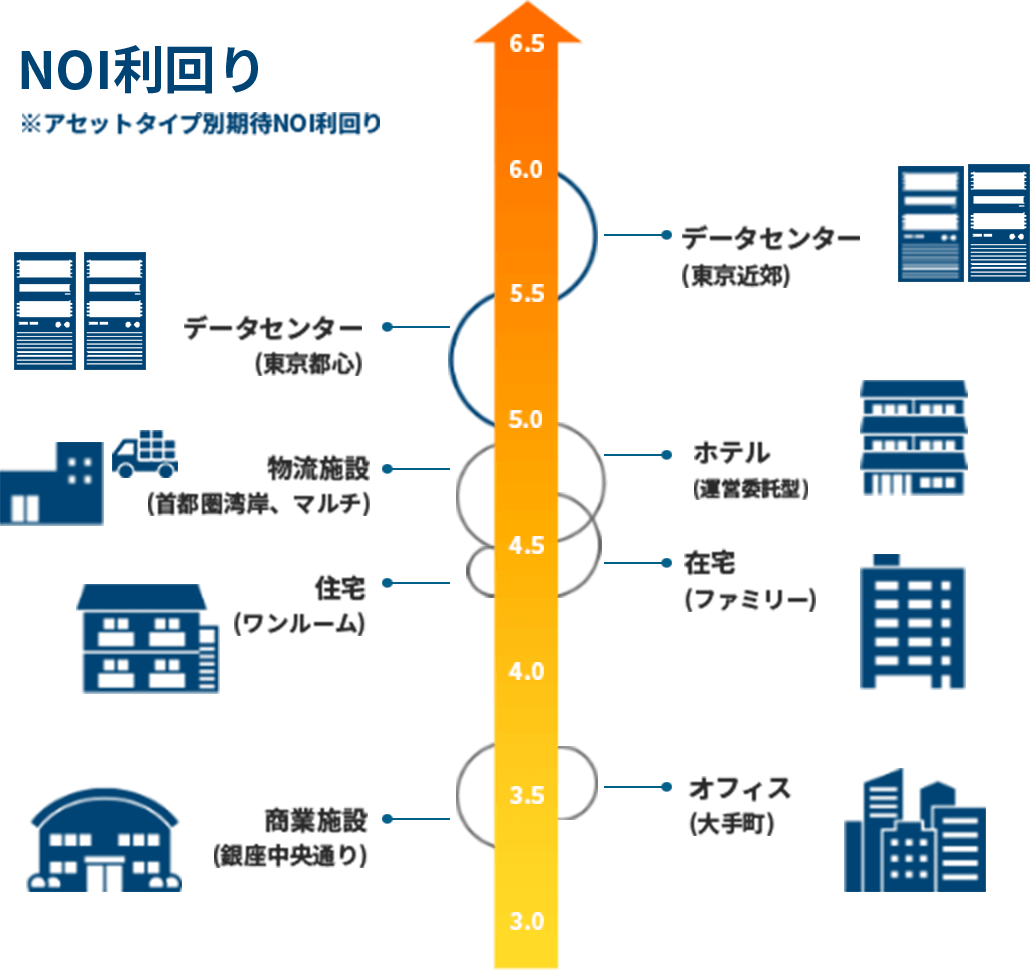 東京大手町のオフィスの期待NOI利回り3.5%に対して、